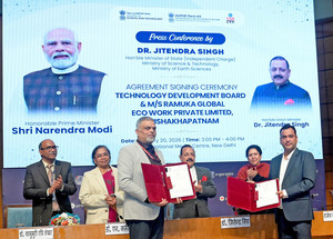 NEW DELHI, JAN 20 (UNI): The Minister of State for Science & Technology (Independent Charge), Earth Sciences (Independent Charge), Prime Minister’s Office, Personnel, Public Grievances & Pensions, Atomic Energy and Space, Dr. Jitendra Singh chairs the Agreement Signing ceremony between Technology Development Board, Department of Science and Technology, Government of India and M/s Ramuka Global Eco Work Private Limited, Visakhapatnam, Andhra Pradesh for the production of ECOFIX- a ready-to-use pothole mix using iron & steel slag aggregates at National Media Centre, in New Delhi on Tuesday. UNI Photo 110U